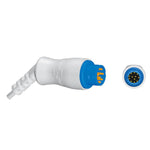 Distal Connector: Male, 12-pin, round, angled connector, keyed.